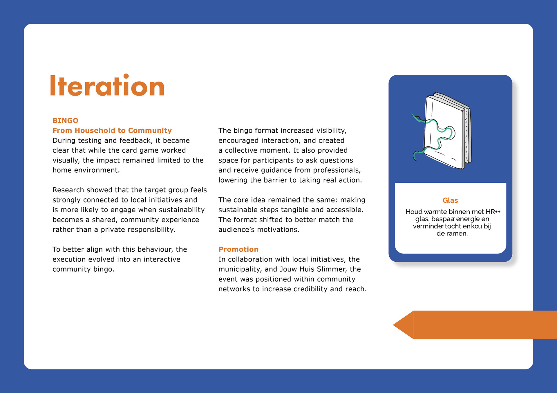 This project taught me how to manage a complex design process and collaborate with multiple stakeholders (my teachers and Jouw Huis Slimmer). I learned to balance different opinions, plan strategically and iterate based on testing as well as to "kill your darlings". The different Municipalities were excited to use this game during their community events.